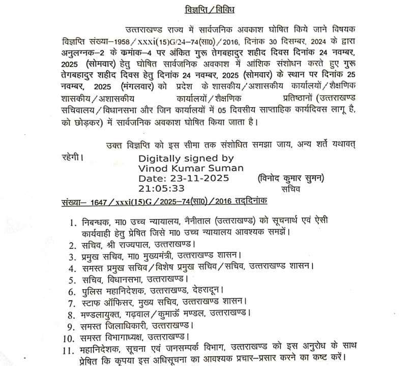 बदली कल की अवकाश की तिथि, अब इस दिन होगी छुट्टी